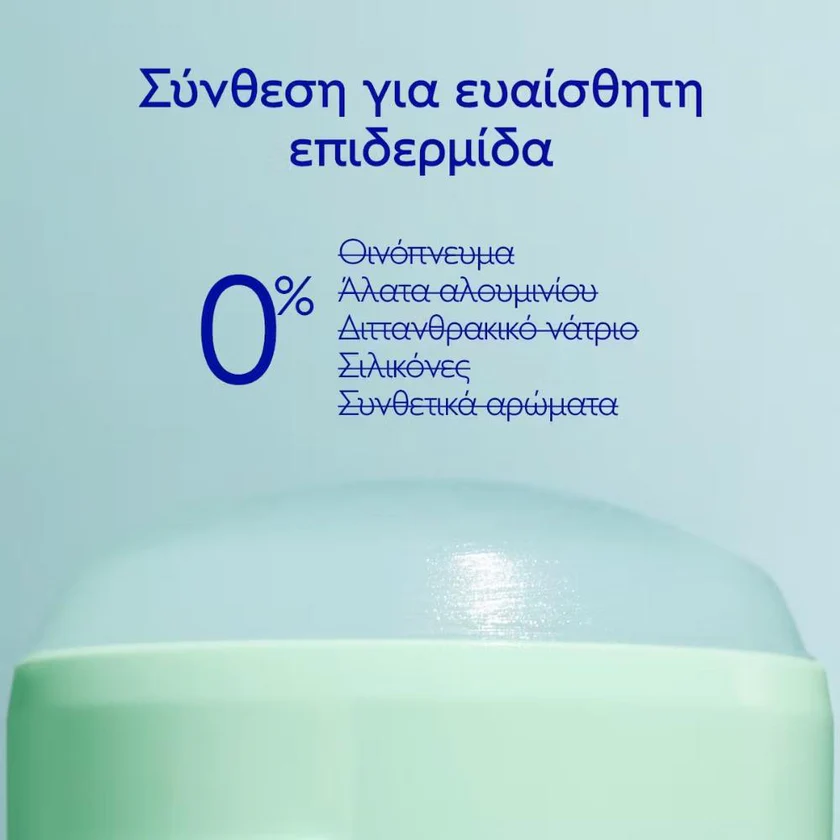 Σύνθεση χωρίς άλατα αλουμινίου, χωρίς οινόπνευμα, χωρίς διττανθρακικό νάτριο, χωρίς σιλικόνες και χωρίς συνθετικά αρώματα. Κατάλληλο για κάθε τύπο επιδερμίδας: