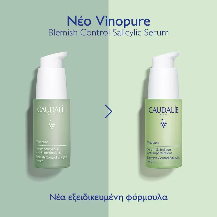 Το Vinopure Blemish Control Salicylic Serum μειώνει όλους τους τύπους ατελειών (σπυράκια, διεσταλμένους πόρους, μαύρα στίγματα) χωρίς φαινόμενο έξαρσης ενώ διαφυλάσσει τον επιδερμικό φραγμό. Αποσυμφορεί και συσφίγγει τους πόρους ενώ παράλληλα βελτιώνει την υφή της επιδερμίδας. Η σύνθεσή του βασίζεται σε συστατικά φυσικής προέλευσης, μεταξύ των οποίων 6 καθαριστικά αιθέρια έλαια. Αυτός ο ορός κατά των ατελειών βελτιώνει ορατά την ποιότητα της επιδερμίδας με τάση ακμής και ξαναδίνει όψη υγιούς λάμψης, χωρίς γυαλάδα.