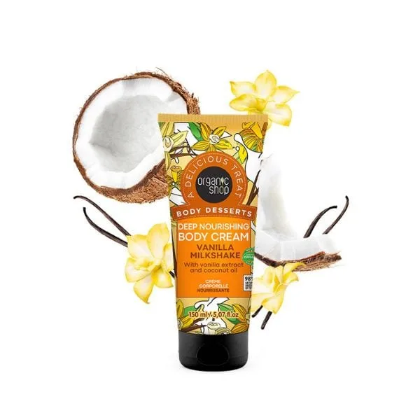 Η Organic Shop Body Desserts Deep Nourishing Body Cream Vanilla Milkshake κρέμα σώματος θα ενυδατώσει σε βάθος την επιδερμίδα και παράλληλα θα αφήσει ένα μοναδικά γλυκό άρωμα που ταξιδεύει τις αισθήσεις.
